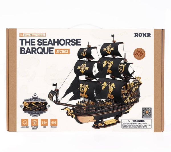 Ontdek het mysterie en de grandeur van The Seahorse Barque, een 603-delige doe-het-zelfpuzzelklassieker van ROKR. Versierd in zwart en goud, is er zowel mysterie als kracht in de ebbenhouten zeilen, het gotische achterstevenkasteel en het gouden zeepaardje als boegbeeld. Dit is geen doorsnee galjoen; de rij glinsterende kanonnen verheft de status als een 16e tot 18e-eeuws oorlogsschip dat koninklijke monarchen diende. Ga deze uitdagende bouw aan en bewapen jezelf met geduld en vaardigheid, want je wordt beloond met een meesterwerk van 470 mm x 180 mm x 390 mm waarmee je kunt spelen en dat je met trots kunt tentoonstellen. Het heeft een draaibaar roer, 8 vierkante en 5 voor- en achterzeilen, ingewikkelde dekgravures en betoverende nautische elegantie die een blijvende indruk achterlaat